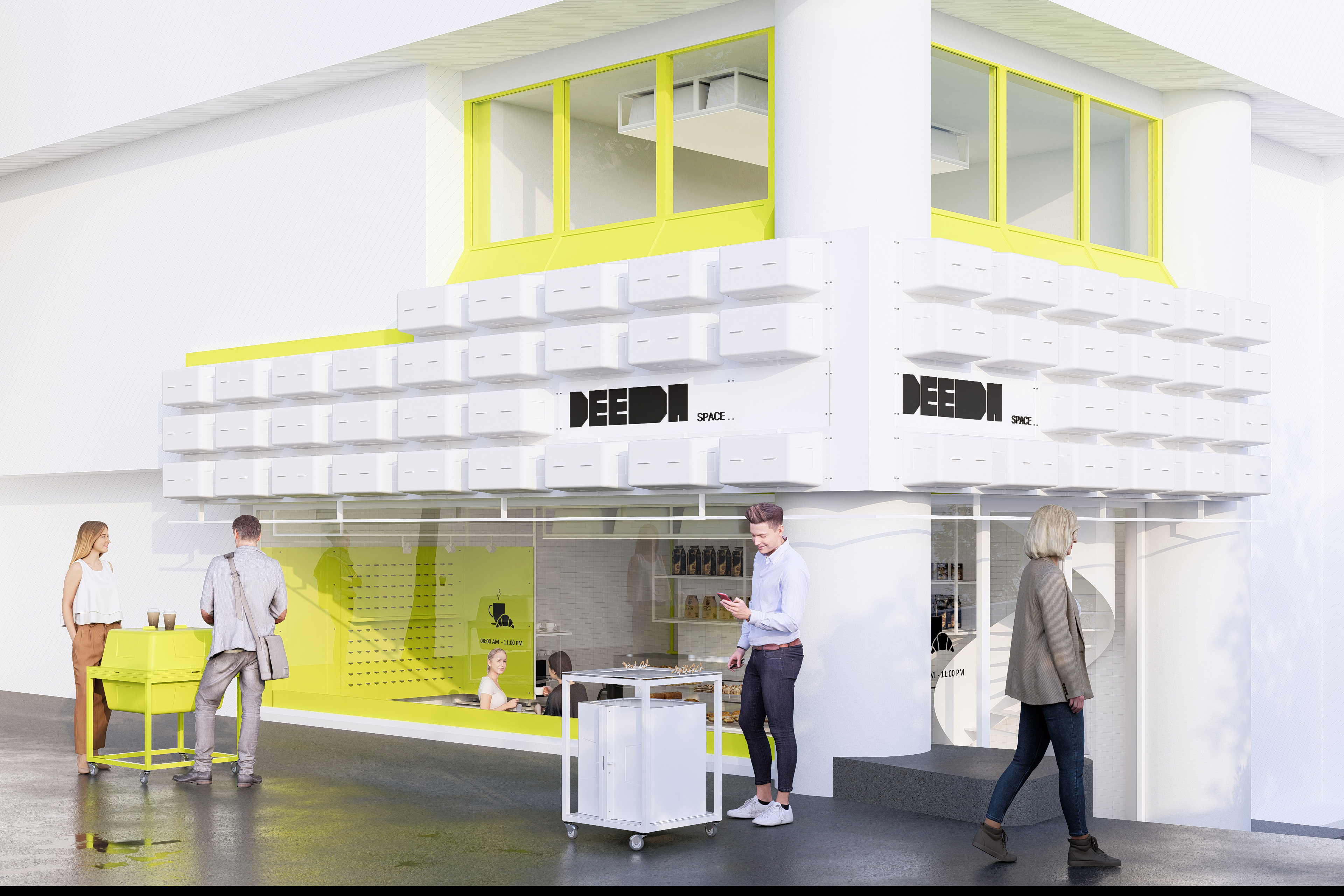 Originally a by-product of concrete construction essentially a “semi-valuable industrial leftover” the waffle mold was not discarded here; instead, it was redefined through a model of architectural upcycling. This inexpensive, pre-fabricated, and typically disposable object became the generative unit of the façade, the surface layer, the furniture, the planters, and even the lightboxes. This decision unified the structural logic across all scales of the project, creating a coherent and systemic design language.