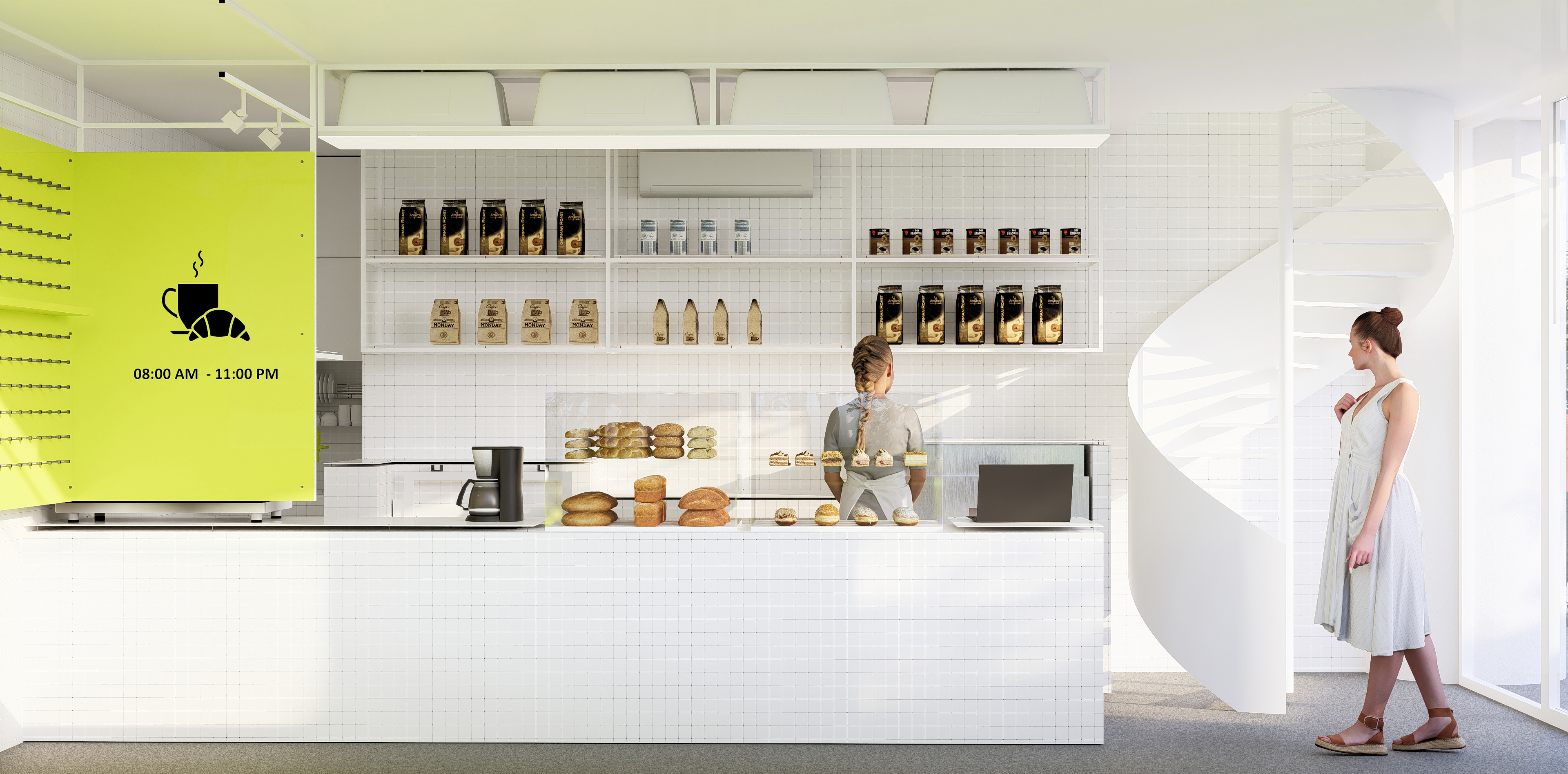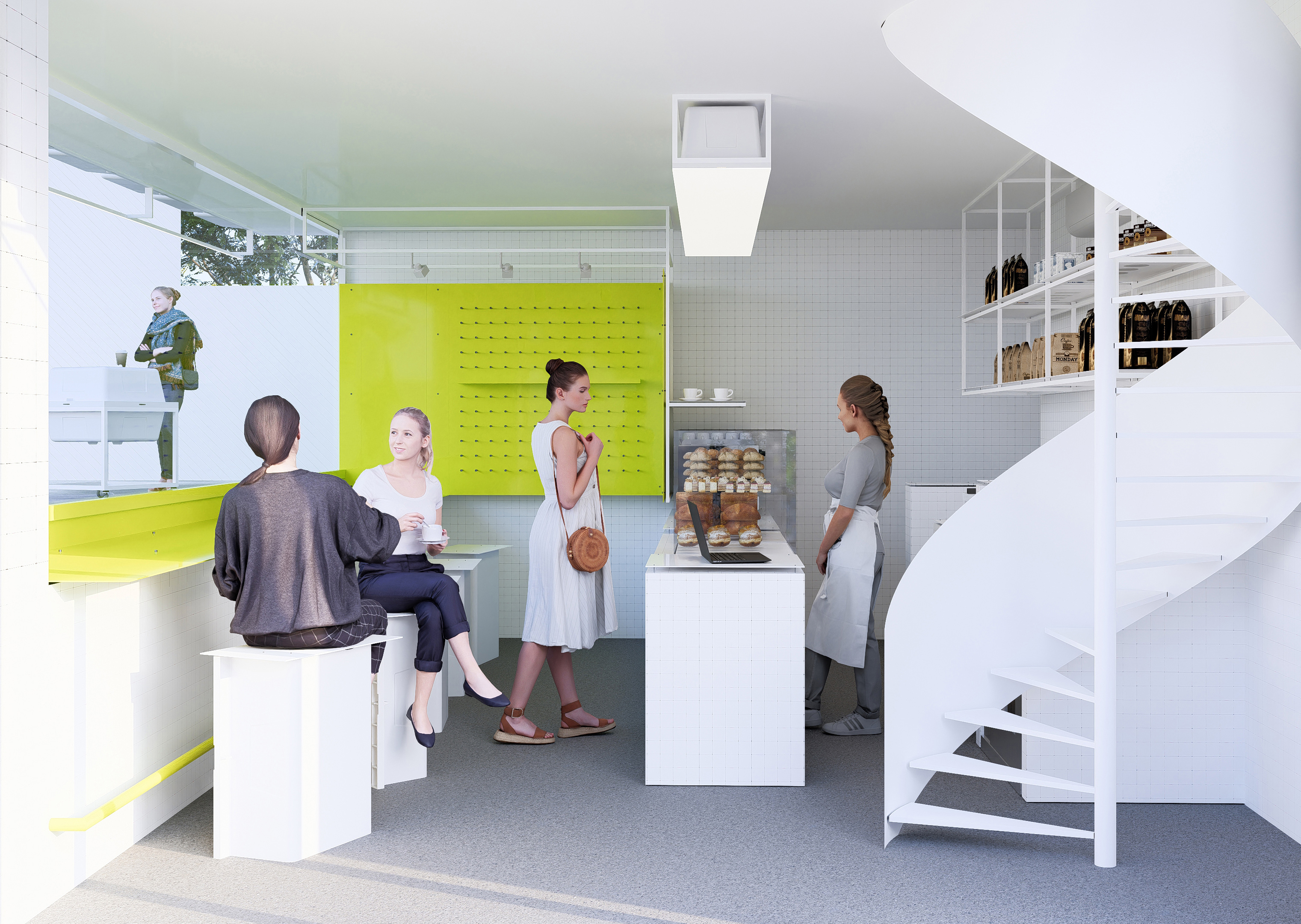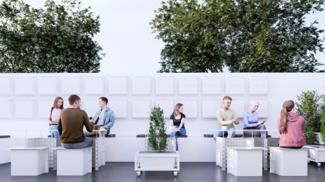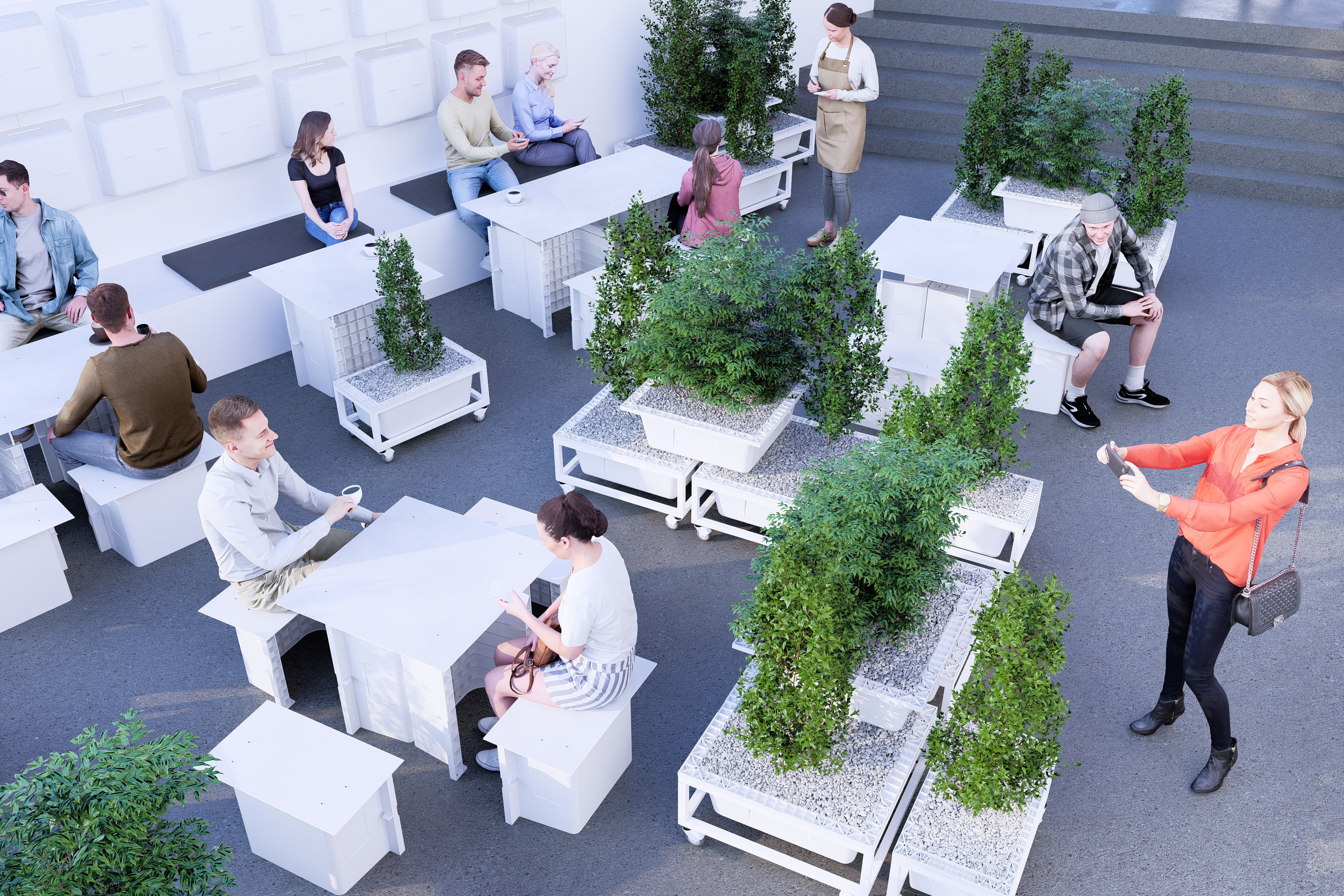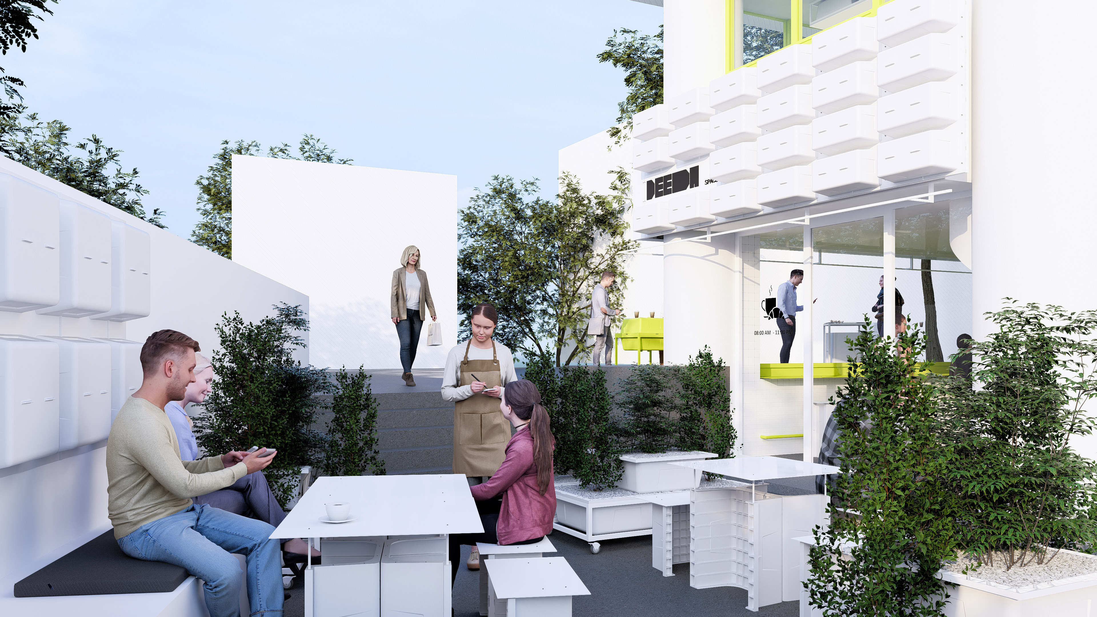 Functionally, all exterior elements from seating and tables to planters were designed within a system of Adaptive Urban Furniture: urban elements that are movable, reconfigurable, and indefinitely customizable. This modular system behaves like a small Micro–Factory, composed of components sharing the same DNA, capable of endless recombination and rearrangement according to daily needs or public events. This operational flexibility stems from the principles of Reversible Architecture, in which built form is defined not by permanence, but by the ability to return, relocate, or transform without destruction.