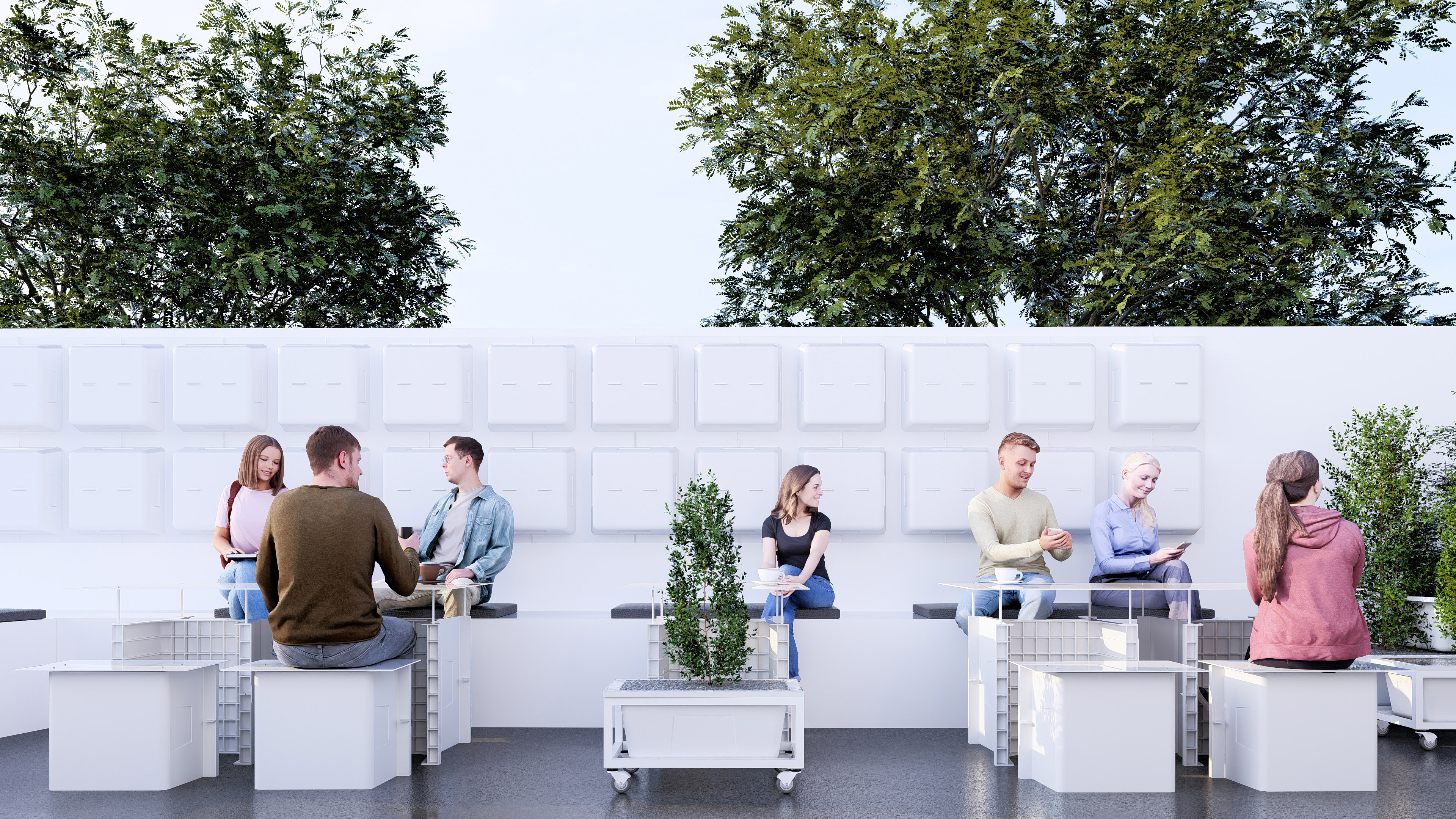 The waffle-based planters with soil, vegetation, and green mass act as Microclimate Modulators in this sun-exposed southern corner: they produce shade, regulate temperature, add localized humidity, and create visual and acoustic filtering. This simple yet effective strategy elevates the environmental comfort of the space.